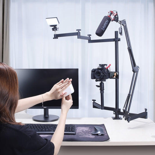 Within the MOJOGEAR range, we have different types of large tripods. For example, large tripod stands that can be up to 179cm high: MOJOGEAR 179cm 3-in-1 tripod: tripod, monopod & horizontal arm or table clamp stands with which you can record the best podcasts: VIJIM LS02 Adjustable table tripod with extension arm - with table clamp .